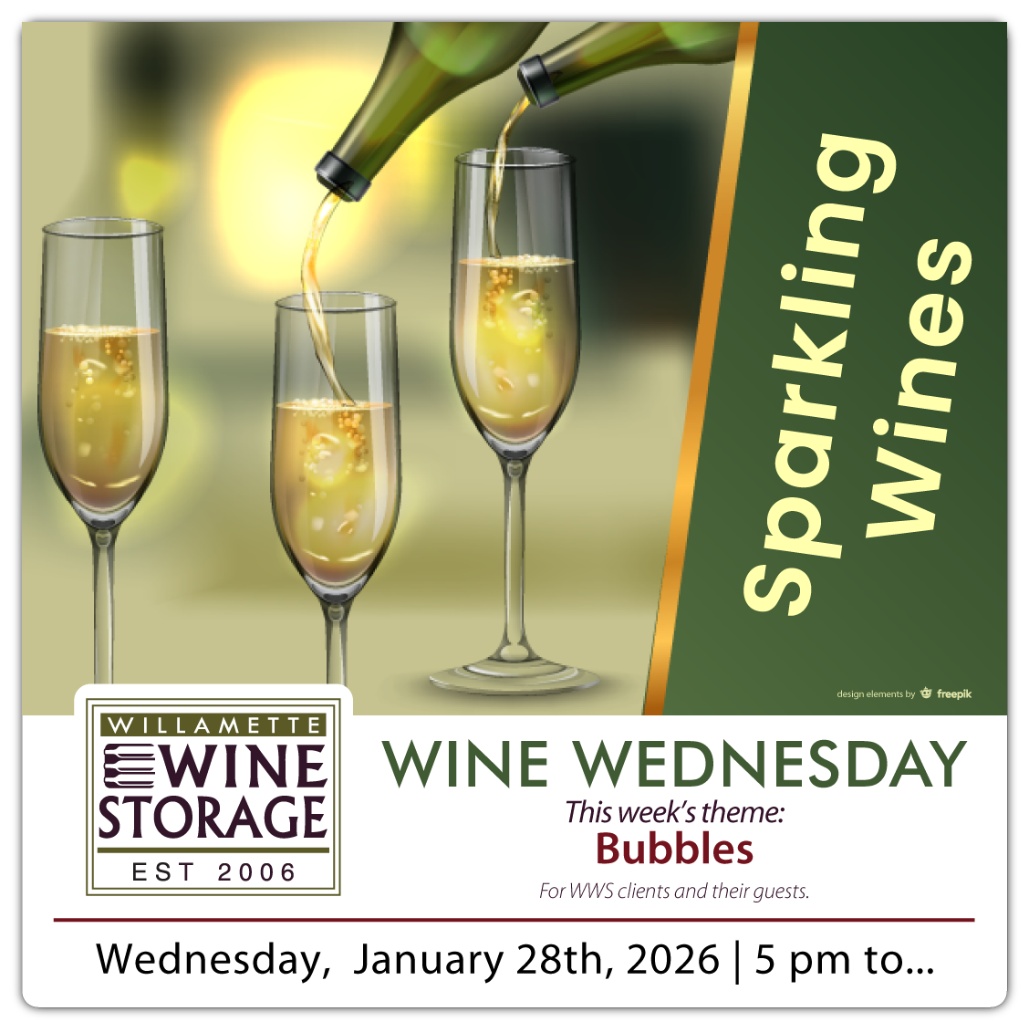 Whether you’re drawn to the refined elegance of Champagne, the playful sparkle of Prosecco, or excited to explore a charming local sparkling favorite, WWS clients and their guests are invited to join us in the tasting room. Bring a bottle of your favorite sparkling wine to share, compare, and discuss. We hope to see you Wednesday evening — cheers!