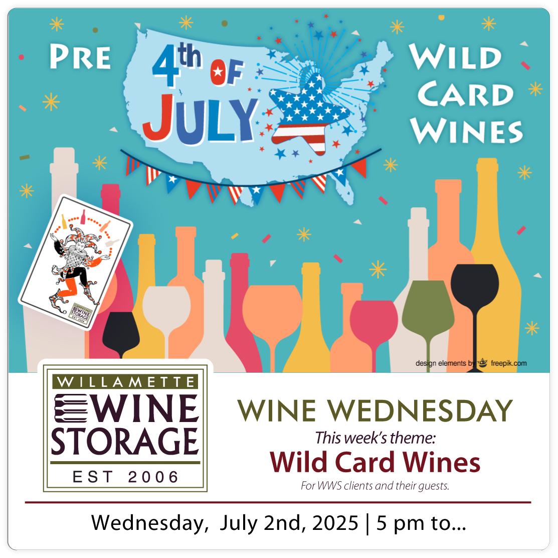 WWS Clients and their guests are invited to join us this Wednesday for our pre-4th of July Wine Wednesday! This week’s theme is “Wild Card,” inviting clients and their guests to bring and share a favorite bottle of their choice. It’s a perfect opportunity to explore diverse wines and enjoy great company.