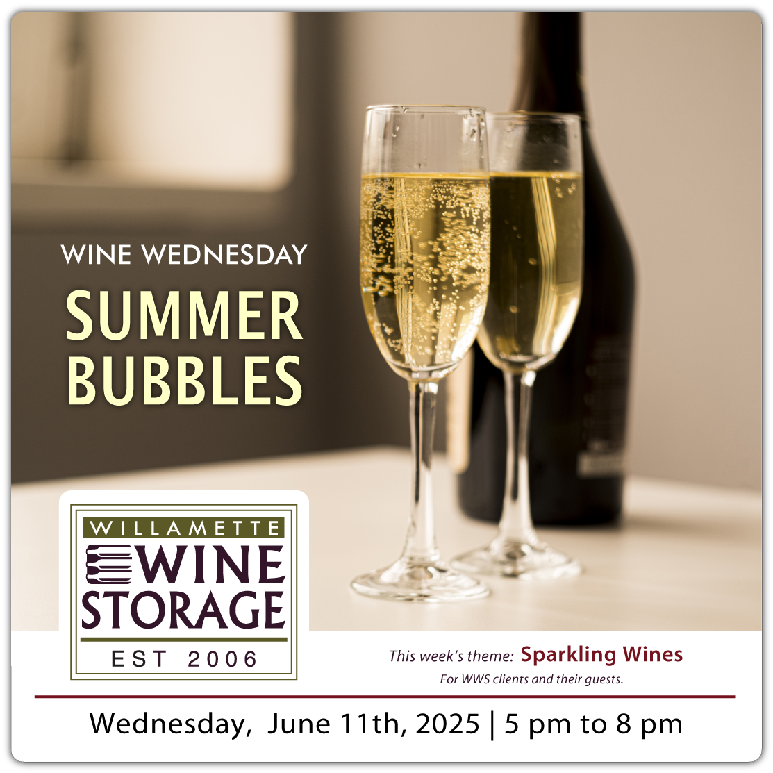 WWS clients and their guests are invited to stop by to join us this Wednesday as we celebrate mid-month “Bubbles” Wine Wednesday theme. WWS clients have the option of opening, sharing and comparing a bottle of a favorite sparkling wine from their locker. Always a fun Wine Wednesday. We look forward to seeing you! Cheers!