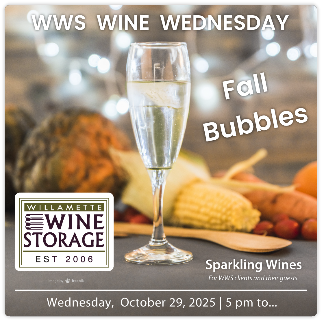As the air cools and autumn settles in, we’re pleased to invite you to our Fall Bubbles Wine Wednesday—let’s raise a toast together before October slips away!